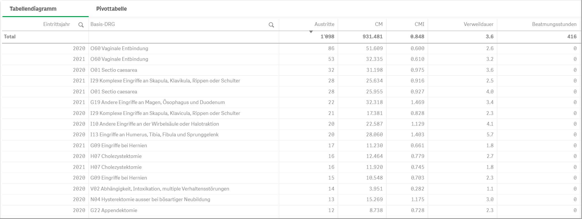 Die Dimensionen (hier im Bild z.B. die Basis-DRG und das Eintrittsjahr) lassen sich in der Pivot-Tabelle per Drag & Drop in eine beliebige Reihenfolge verschieben. So kann beispielsweise das Eintrittsjahr als Spalte zusätzlich zu den Werten dargestellt werden.