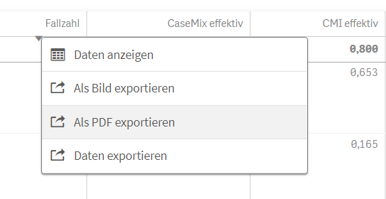 Ein Rechtsklick auf ein Objekt öffnet ein Kontextmenü. Hier lässt sich zwischen der Daten-/Diagrammansicht umschalten, das Objekt als Bild oder PDF exportieren oder die Daten exportieren. Der Datenexport läuft automatisch ab, die Daten können danach in anderen Programmen weiterverarbeitet werden.