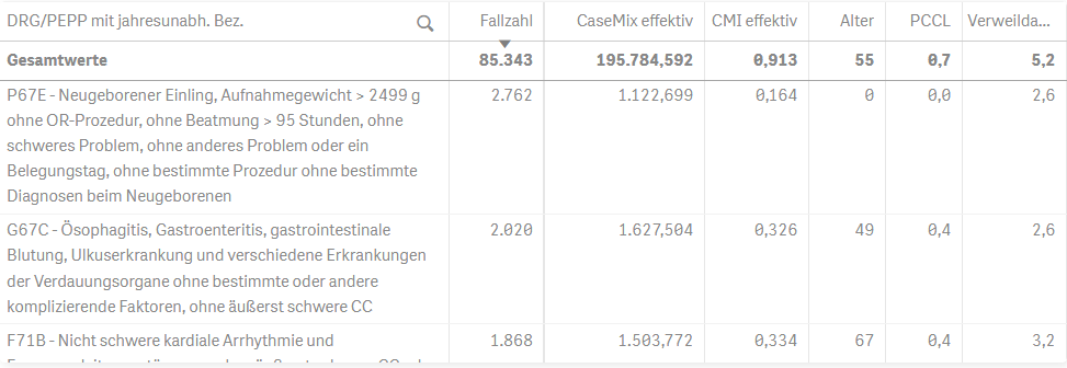 Mittels eines Klicks auf das “+” Zeichen wird eine weitere Dimension (hier im Bild z.B. eine weitere Basis-DRG) in der Zeile angezeigt.