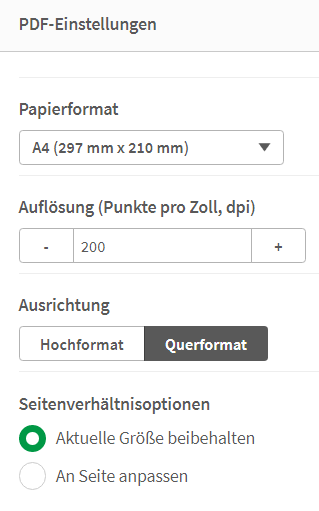 Papierformat, Auflösung, Ausrichtung sowie die Seitenverhältnisoptionen können vor dem Export eingestellt werden.