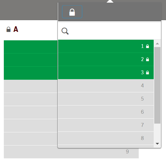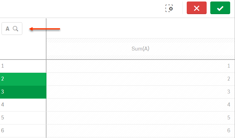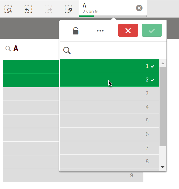 Wird die Lupe angewählt, öffnet sich das Auswahlmenü des jeweiligen Feldes. Hier getätigte Änderungen werden im Arbeitsblatt sofort sichtbar. Durch einen Klick zurück ins Arbeitsblatt oder auf das grüne Häkchen wird die Auswahl bestätigt. Das rote „X“ macht die Auswahl rückgängig.
