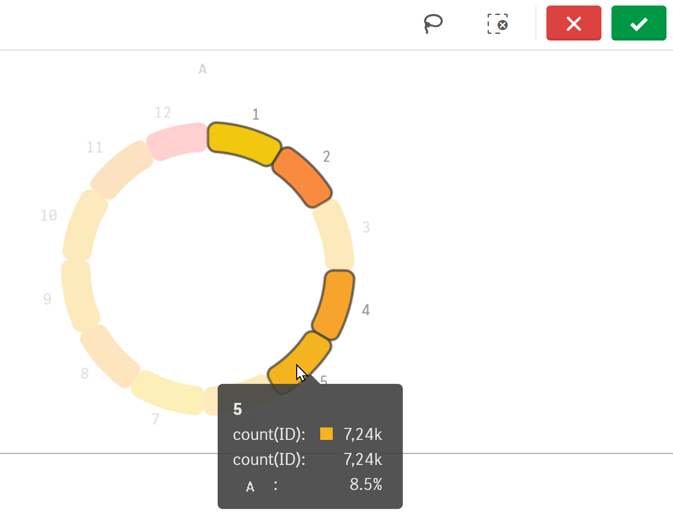 Im folgenden Kreis-Diagramm wurden die Werte 1, 2, 4 und 5 angeklickt und dadurch ausgewählt. Die Auswahl wird mit Klick auf die grüne Schaltfläche mit Häkchen bestätigt. Alternativ genügt es auch, außerhalb der Visualisierung zu klicken.
