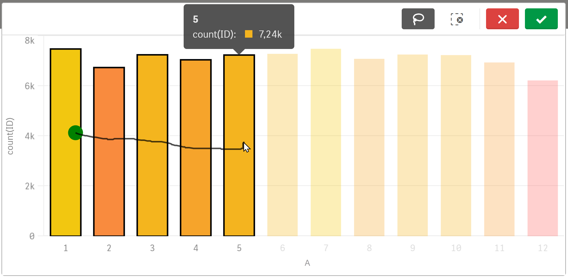 Mit Hilfe einer Freihandlinie können mehrere Werte ausgewählt werden. Zum Aktivieren der Markier-Auswahl kann entweder in die Visualisierung und dann auf das Lasso-Symbol geklickt werden oder die Auswahl mit gedrückter Umschalttaste vorgenommen werden.